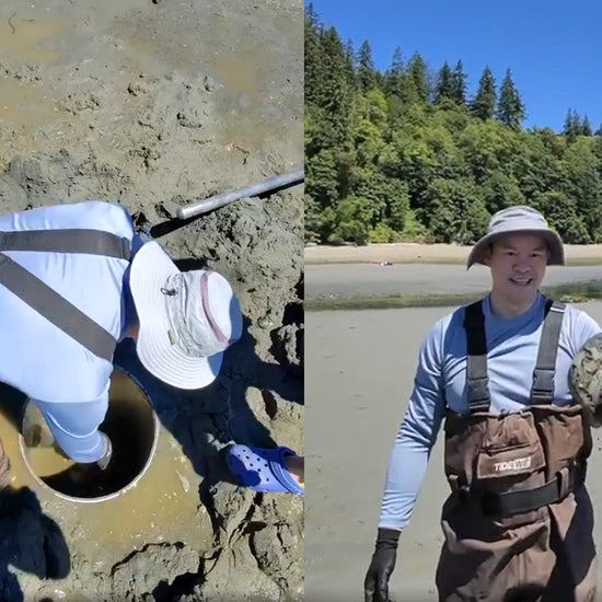 Unlike razor clams, a geoduck (“gooey-duck”) will not "run" or dig down any deeper in the sand as you dig for it. The main purpose of the geoduck tube, therefore, is to encircle the geoduck and prevent the sand from collapsing in as you dig down to reach the geoduck. Center the geoduck in the middle of the tube and then work the tube as far down in the sand as you can. The tube can be vigorously wiggled back and forth while applying downward pressure. When you are unable to push it down any further, you can try placing a plank of wood across the top of the tube and using a heavy hammer or mallet, to drive the tube deeper in the sand. The geoduck will likely mostly retract its neck once you disturb the sand around them. Carefully remove sand and water from the inside of the tube until you reach the geoduck. When you get down to where you can see/feel the neck, the shell is probably down an additional 6" to 8". You need to continue carefully digging deeper until you can run your fingers around the whole geoduck's shell enough to loosen the sand's grip on the shell. Don't try just pulling the neck, as you will likely pull it off where it joins the upper part of the shell.