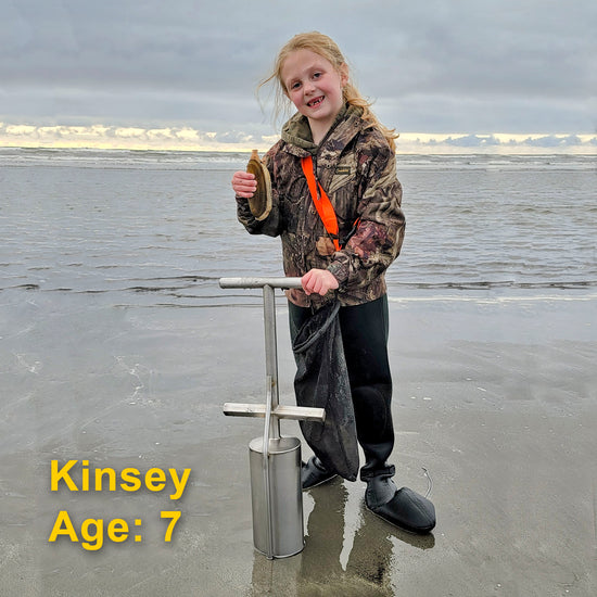 Our 28" clam guns are designed specifically for young kids. They come with a shorter, 12" barrel and our Lil' Desperado version features foot pegs to help your little clammers get all of their weight on the gun to get it down into the sand.
